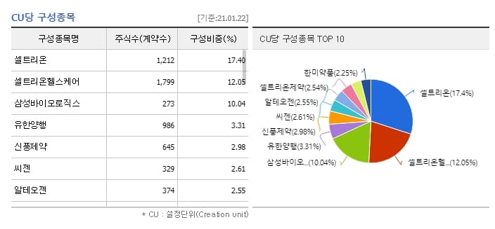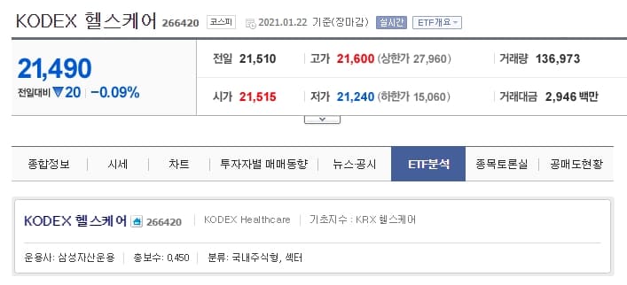 'KODEX 헬스케어'는 국내 헬스케어 산업의 우량 기업을 모아둔 종목입니다. 구성 종목을 보시면 헬스케어 관련 기업들로만 구성되어 있다는 것을 확인하실 수 있죠?