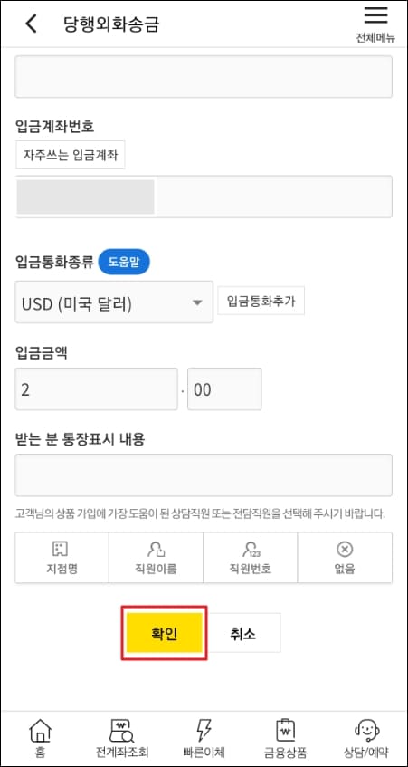 입금 금액은 자동으로 설정이 됩니다. 2 USD이죠. 확인 버튼을 클릭해준 뒤 송금 과정을 거쳐주시면 국민은행 외화통장 비대면 계좌개설이 완료됩니다.