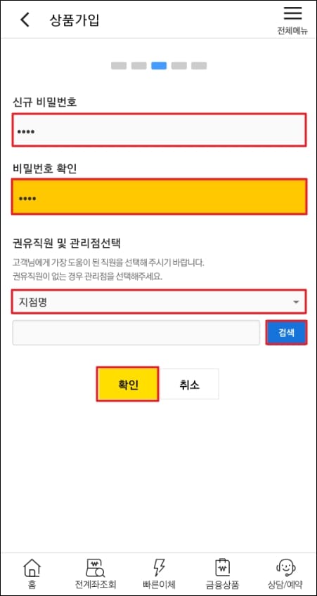 하단의 권유 직원 및 관리점 선택 항목의 경우는 권유 직원은 입력하지 않으셔도 되지만 관리점은 필수로 선택해주셔야 합니다.