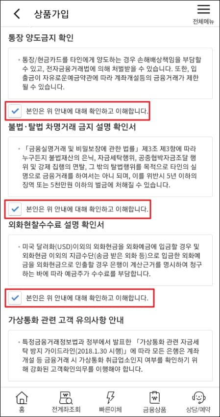 상품 가입 단계입니다. 상품 설명서와 약관 전체보기를 모두 한 번씩 클릭해주셔야 하단의 체크 박스가 활성화됩니다. 모든 체크 박스에 모두 체크를 해주신 뒤 노란색 확인 버튼을 클릭해주시면 됩니다.