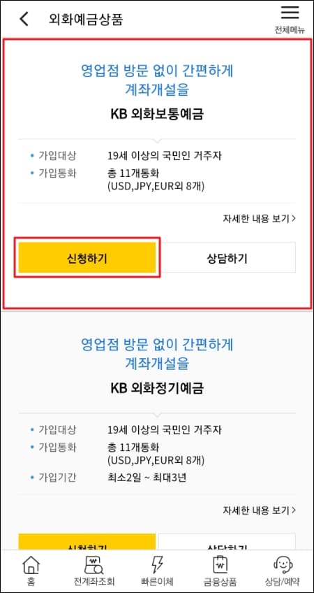 영업점 방문 없이 간편하게 계좌개설을 할 수 있는 KB 외화보통예금 섹션에서 '신청하기' 노란색 버튼을 클릭해주세요. KB외화보통예금은 여러 외화통화를 한 통장으로 자유롭게 입출금 할 수 외화통장입니다.