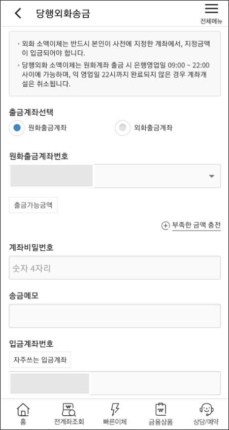 사전에 설정한 출금계좌번호를 입력하고 계좌 비밀번호를 입력합니다. 그리고 입금계좌번호에 신규 개설한 국민은행 외화통장 계좌번호를 입력해주시면 되겠죠?