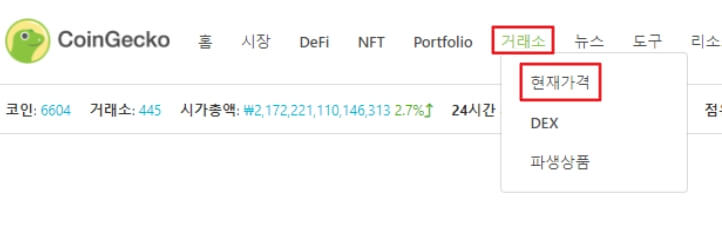 우리가 알아보려는 가상화폐 거래소 순위는 상단 메뉴 중에서 '거래소' 클릭 후 '현재 가격' 순으로 클릭하시면 코인게코 신뢰 지수 기준 전 세계 상위 암호화폐 거래소 순위를 확인하실 수 있습니다.